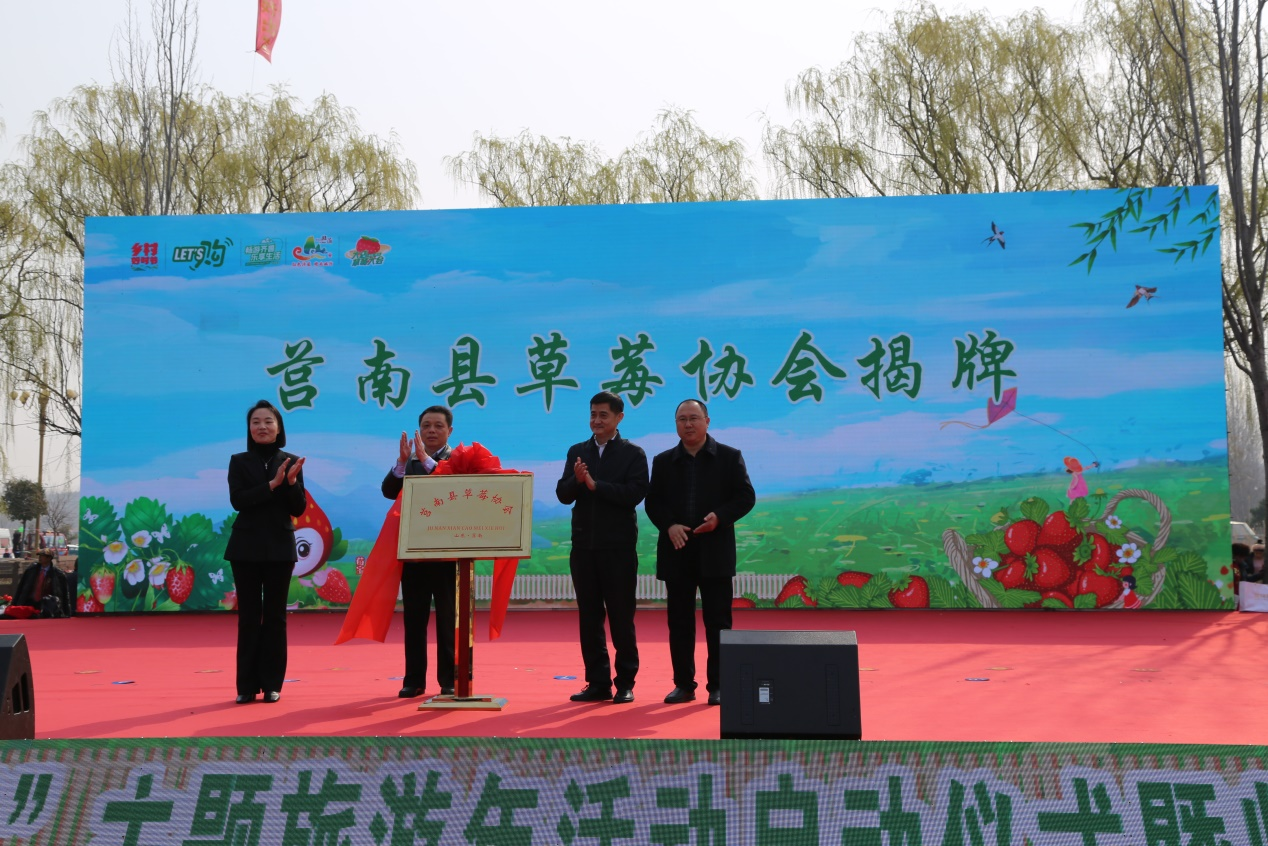 市农业农村局二级调研员刘强、市文化和旅游局党组成员高弘清、莒南县政府副县长朱礼珂、山东省家庭农场协会常务副会长刘斌杰为莒南县草莓协会揭牌。
