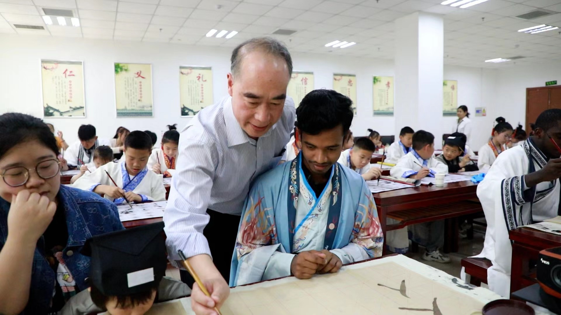 齐腰襦裙、琵琶飞袖,传统汉服尽显风雅之美;一招一式、刚柔并济,张弛有度之间意动行随;笔墨纸砚、走笔游龙,挥毫泼墨恰似行云流水;书声朗朗、致敬先贤,论语为桥传承千年文化……5月13日,一场关于中国传统文化的奇幻之旅开启,来自几内亚、孟加拉、乍德等国家的孟岩、达也、苏欧玛、科瑞、穆萨共5位临沂大学外国留学生走进临沭,穿汉服、学汉礼、习书法、诵国学、练八段锦,解锁传承千年的中国传统文化的独特魅力。