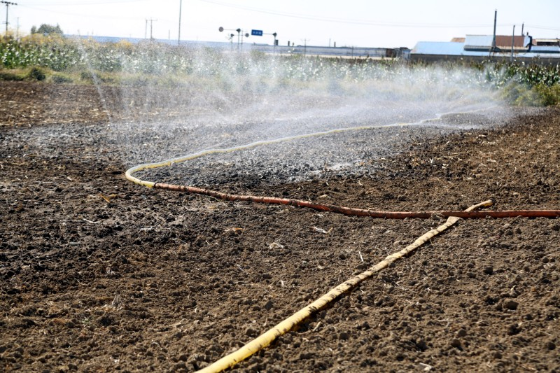 山东商报·速豹新闻网 通讯员王从金10月17日,临沂市临沭县大兴镇兴大食品有限公司大蒜生产基地员工正在利用节水灌溉设备造墒备秋播。近期