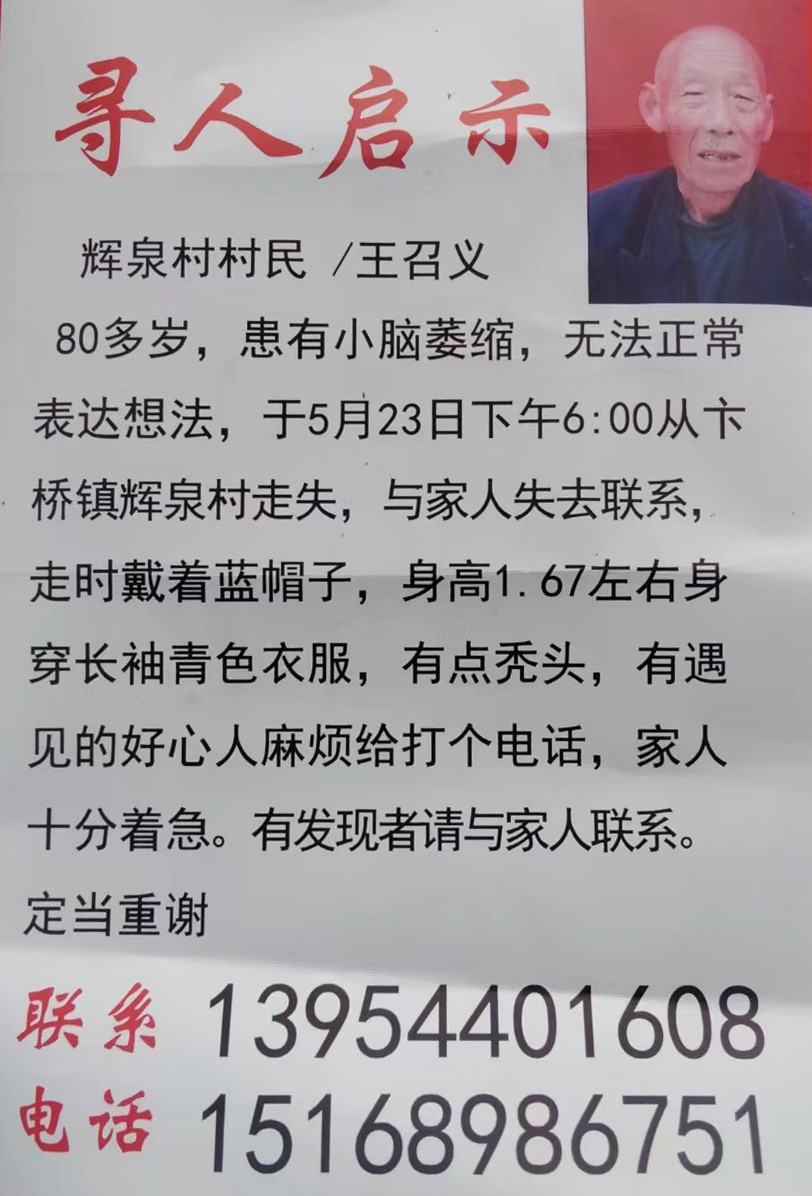 临沂市平邑县卞桥镇辉泉村村民王召义于5月23日下午6:00时从辉泉村走失,与家人失去联系。王召义:80多岁,患有小脑萎缩,无法正常表达想法