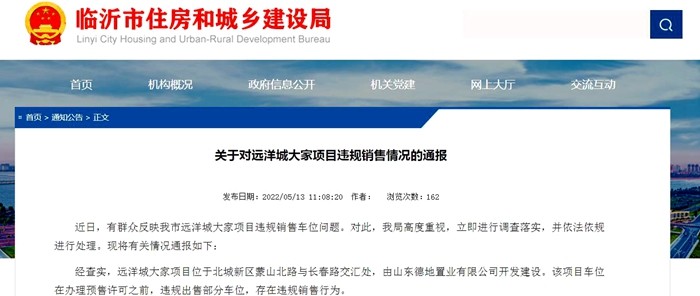 山东商报·速豹新闻网张春兄5月13日,记者从临沂市住房和城乡建设局官方网站获悉,由山东德地置业有限公司开发建设的远洋城大家项目,因违