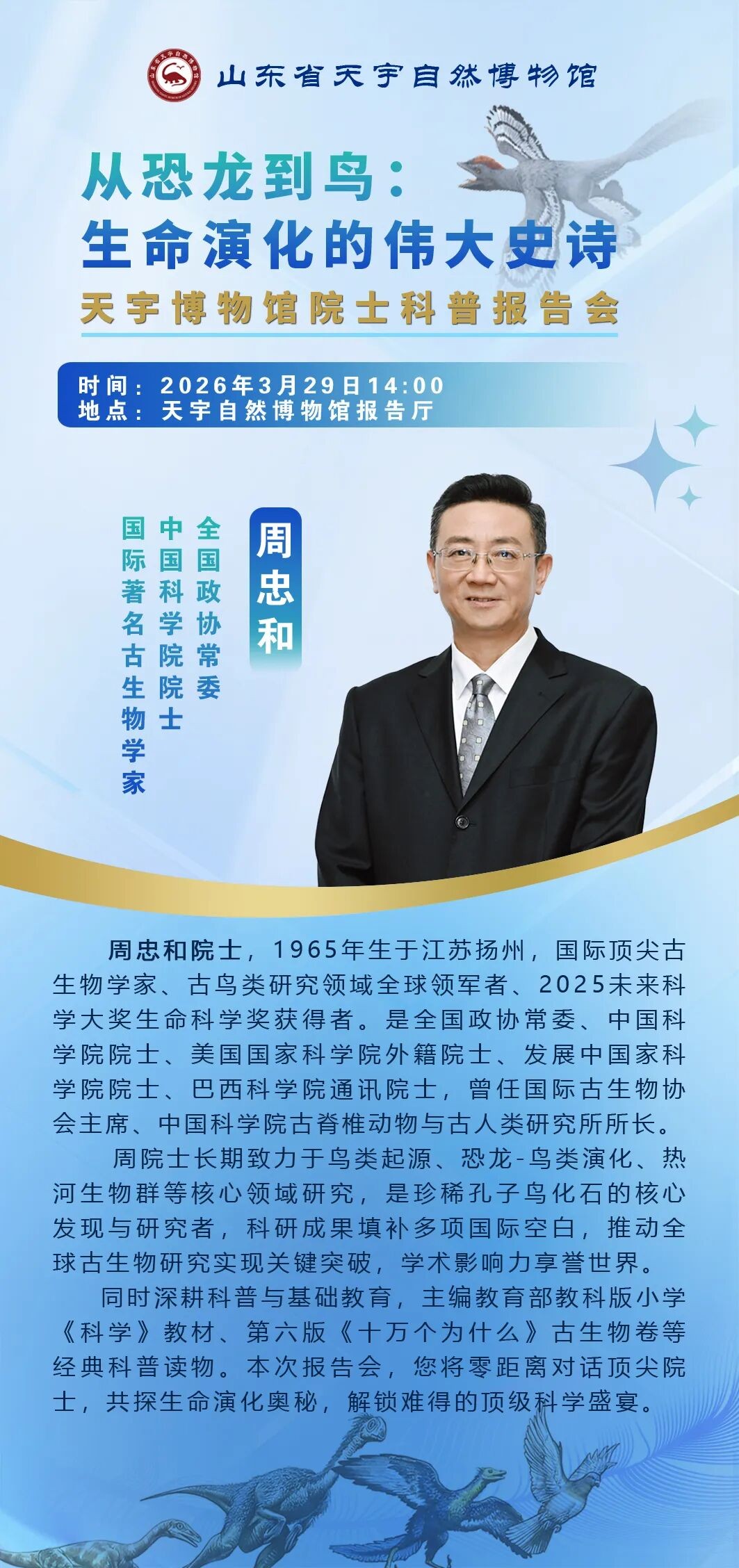 本次科普讲座主题为 “鸟类起源与早期演化的故事”,将于 2026 年 3 月 29 日 14:00 在天宇博物馆五楼报告厅开讲。