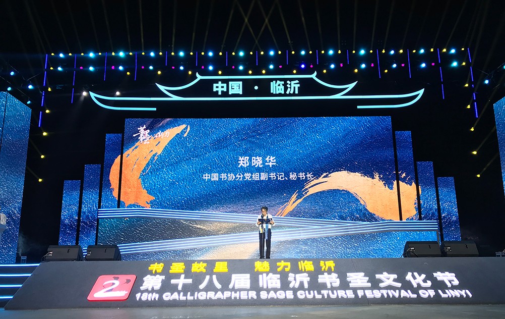 郑晓华指出,书法作为中华优秀传统文化的瑰宝,是中华民族独有的文化标识,更是华夏精神气质的典型象征。山东省历史文化悠久、书法底蕴深厚。近年来,山东省广大书法家和书法工作者根植齐鲁文脉与时代精神的沃土,崇德尚艺、潜心耕耘,在书法创作、理论研究等方面不断取得了新的可喜成绩,呈现出生机勃勃的气象,形成了具有鲜明地域特征的齐鲁书风,山东书法队伍已成为中国书坛一支重要的生力军。临沂市高度重视书法艺术的传承与发展,努力打造特色书法品牌,致力提升社会审美水平与人文素养,书法艺术已经融入城市文化血脉,成为临沂市一张精彩亮丽的城市名片。衷心希望临沂市广大书法家和书法工作者坚持以人民为中心的创作导向,根植齐鲁文化沃土,充分发挥山东书法资源优势,以精品力作不断满足人民文化需求、增强人民精神力量、反映时代正大气象,积蓄起建设社会主义文化强国的深厚底气,饱蘸浓墨共同为新时代中国书法事业发展作出新的更大贡献。