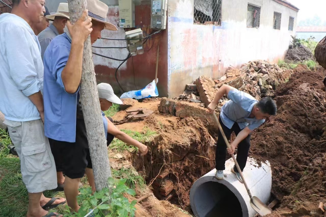 施工现场,挖掘机轰鸣作响,运输机械和人力齐头并进,村党支部书记亲自带领村党员干部坚守现场。他们顶着炎炎烈日,奋战在泥泞之中。经过艰苦努力,成功在村头开挖沟渠230余米,布设地下水泥管道41节,全面打通了村庄排水淤堵的“毛细血管”,为全村群众平安渡汛提供了可靠保障。