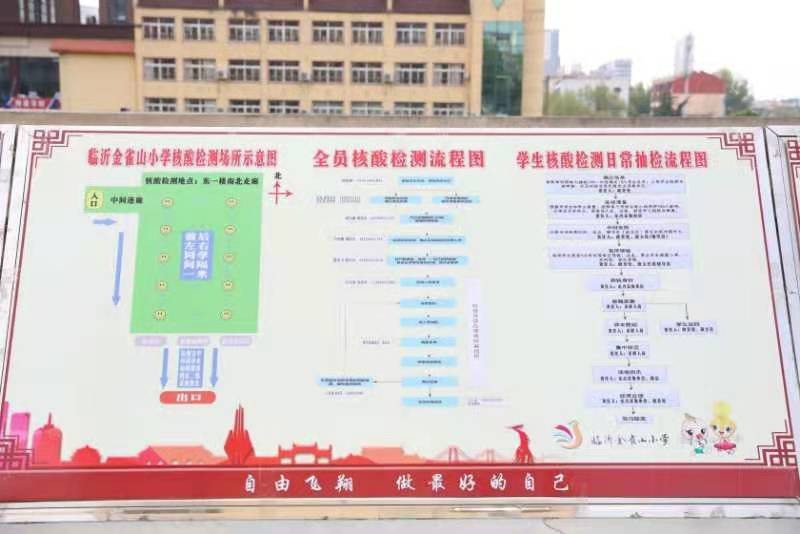 虽然还未复学,但是兰山区中小学的教师们都在忙碌着。在金雀山小学,学校在校门口摆放了疫情防控工作展板,明确校园疫情防控各项流程、措施和要求;在空气流通的走廊,设置专门的室内检测点,方便高温或雨水天气师生核酸检测;在办公楼二楼设立留观室,可以随时安置发热师生留观隔离……